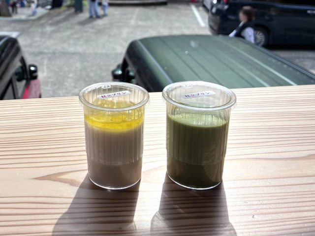 今回選んだのは、有名な杖立プリンのはちみつヨーグルト味と抹茶味です!